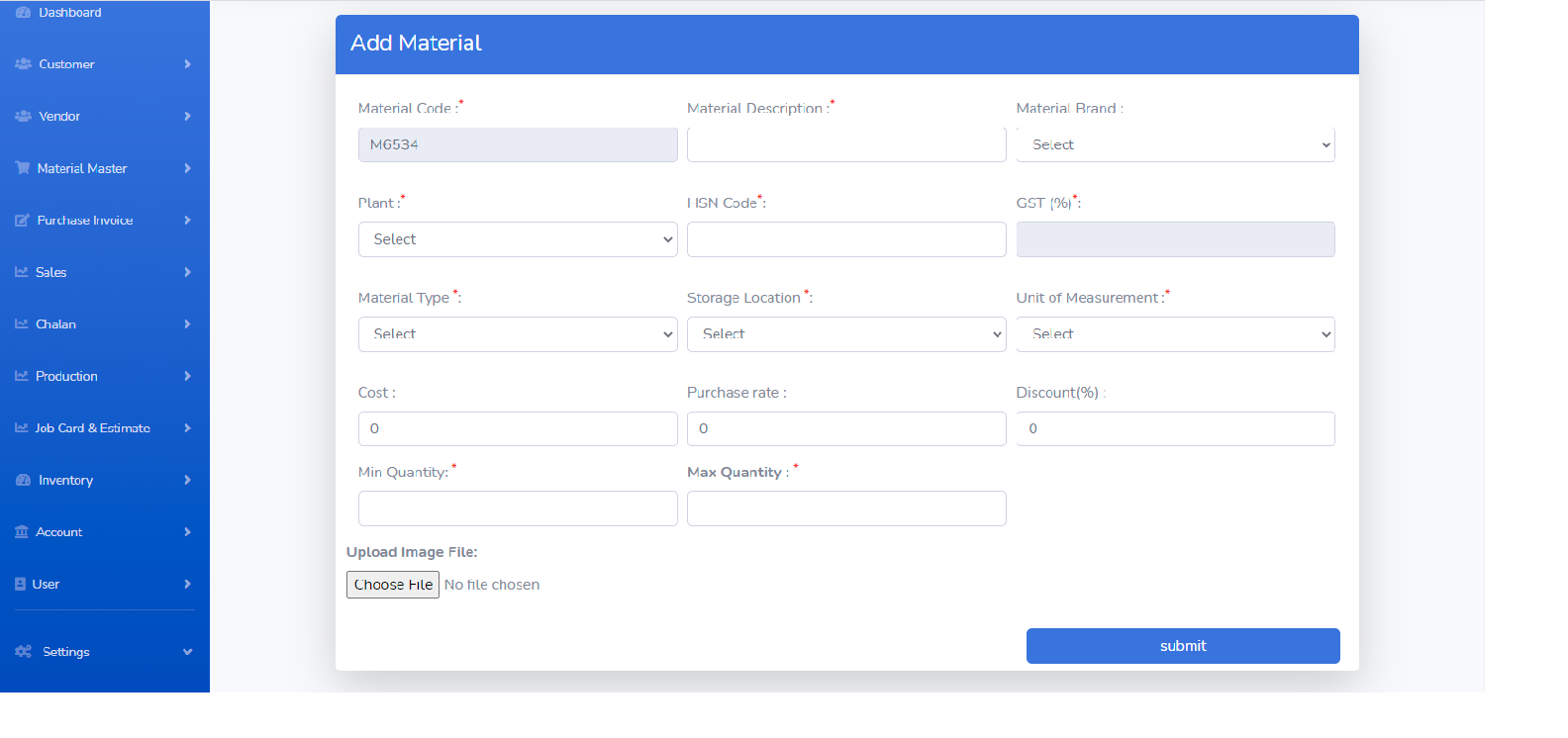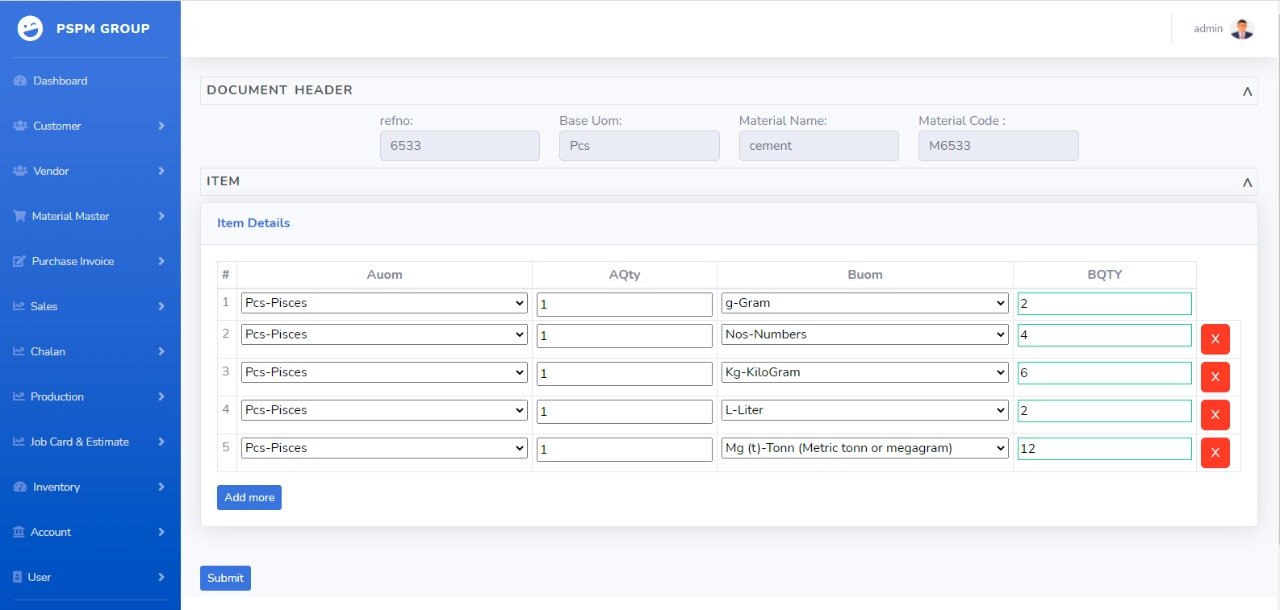 Easily adding material using PSPM ERP solution, using which we can add and manage the material details of specific material. Details like Purchase rate, MRP, min & max required qty, which will help business to make purchase orders and calculating the inventory.